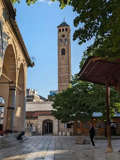 By mid-afternoon we had arrived at the Hotel Sahat in the heart of the old town, right by the Miljacka river and the Latin Bridge. At 5:00pm our guide, Amed, met us at the hotel for a two hour tour of the town. The first port of call was no more than 50m from the hotel. It was here on 28th June 1914 on Obala Kulina bana where a nineteen year old Bosnian Serb student named Gavrilo Princip assassinated Archduke Franz Ferdinand of Austria and his wife Sophie. Princip and five other students were co-opted by the Serbian terrorist group Black Hand to achieve their objective of disrupting the rule of the Austro-Hungarian empire in an effort to form a south Slavic nation which would eventually come into existence and be known as Yugoslavia. In response to the assassination of the heir to the throne the Empire declared war on Serbia and WWI ensued. It’s a very interesting story.